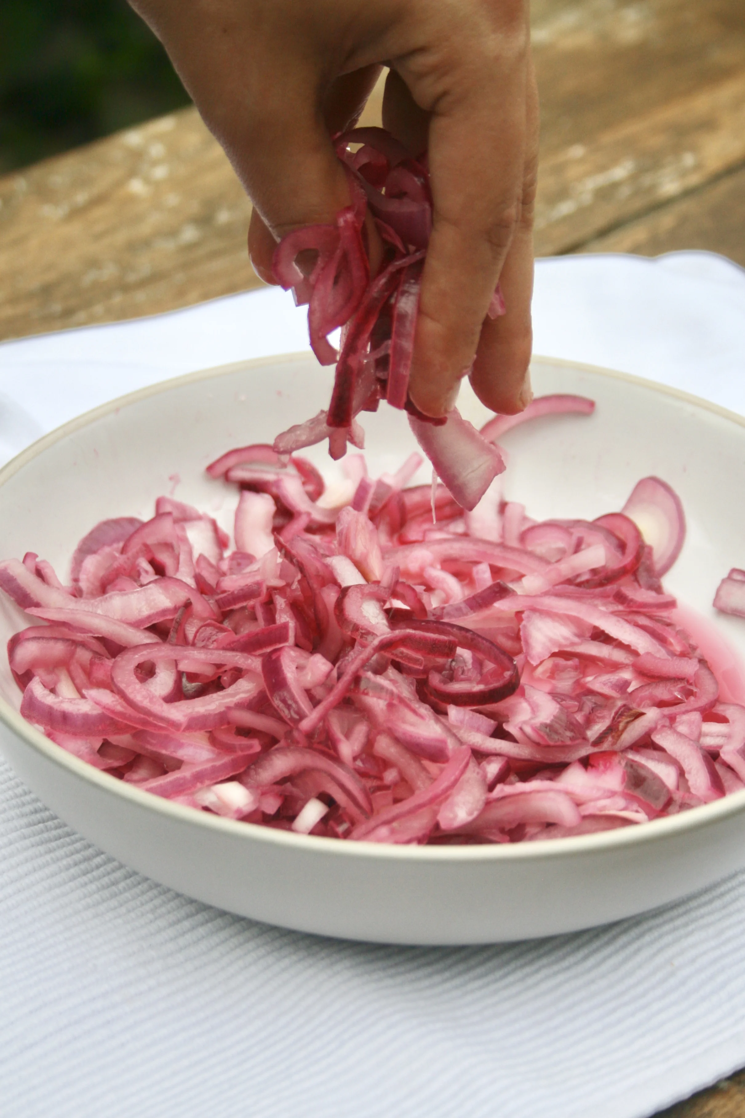 This is one of my new favourite ways to eat courgettes, straight off the grill or as chilled leftovers the next day, they make the perfect side on warm summer days. Not only is this so easy to prepare, but it combines the most fresh and mellow tone of the courgettes with the tart punch of the quick pickled red onions. Definitely a crowd pleaser!